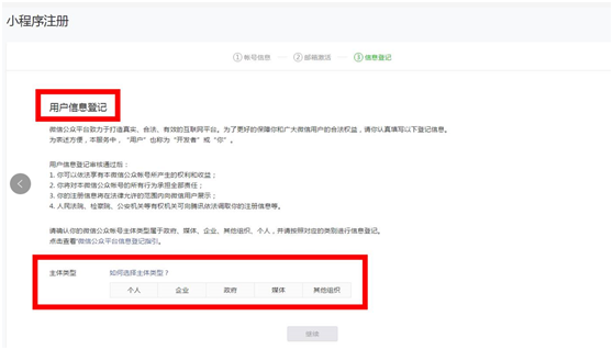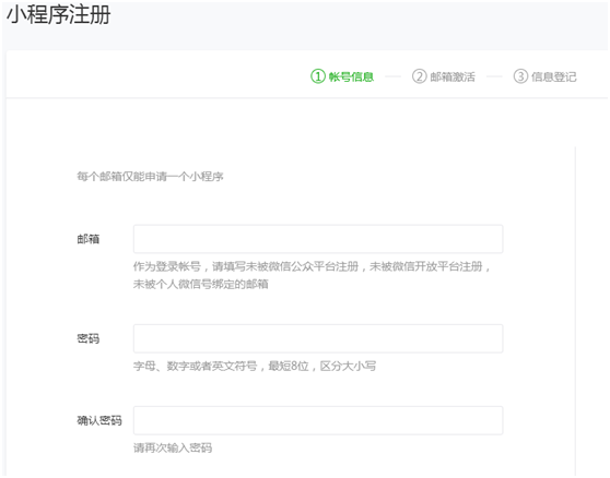 2、使用常用的邮箱帐号注册,并且未在微信公众号、微信开发平台、个人微信号等平台注册、绑定过的邮箱;