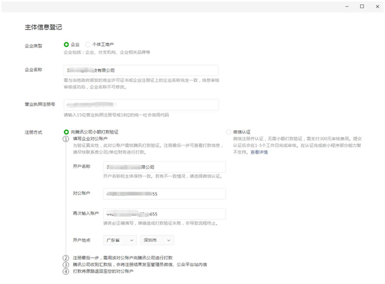 确定提交之后,按照页面提示流程,使用对公账户向腾讯打款验证即可。