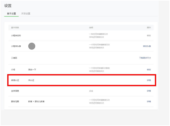 认证入口:登录小程序 - 设置 - 基本信息 - 微信认证 - 点击“详情”进入