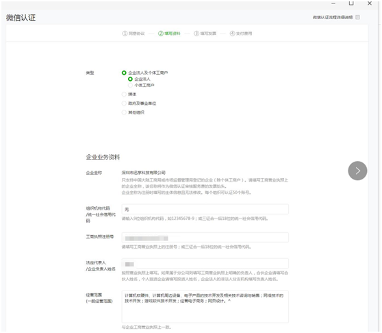 认证流程:同意协议 - 填写资料 - 填写发票 - 支付费用