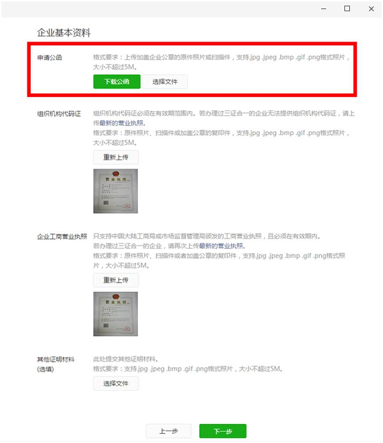 1、填写基本信息、营业执照、组织机构代码、企业法人/经办人等信息