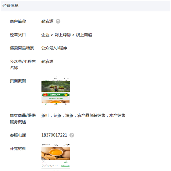 填写商户简称、选择经营类目、客服电话以及其他辅助资料。