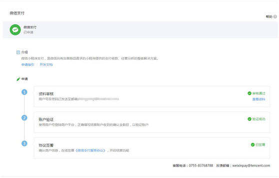 确认商户信息,签署《微信支付服务协议》,开启结算功能,即可正常使用微信支付。
