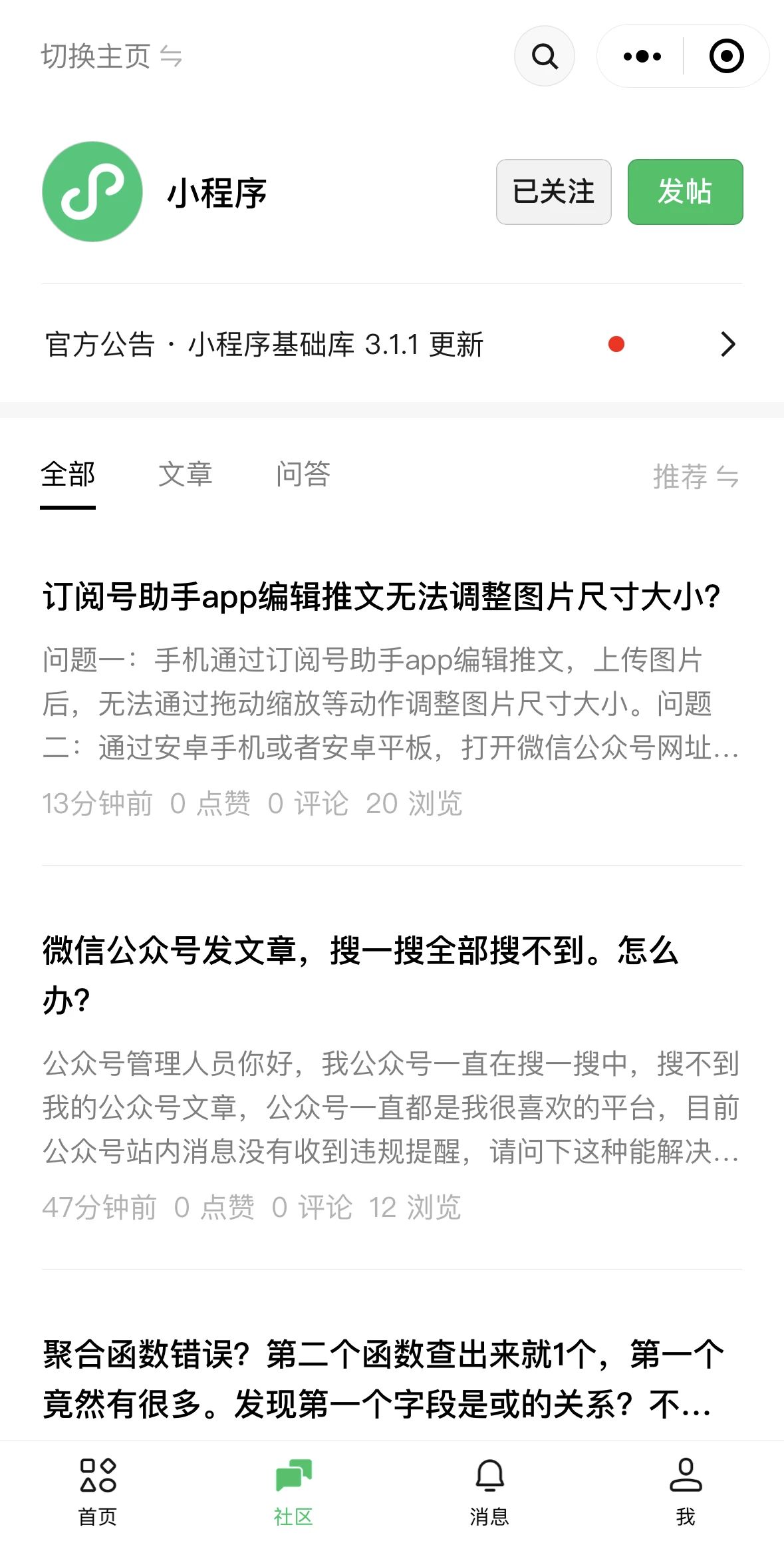 只要涉及到微信相关的问题,大部分都能在这个社区得到解决,在这里有很多常见问题的解决方案也有官方最新动态以及提出问题后能得到官方人员和贡献者的解答。